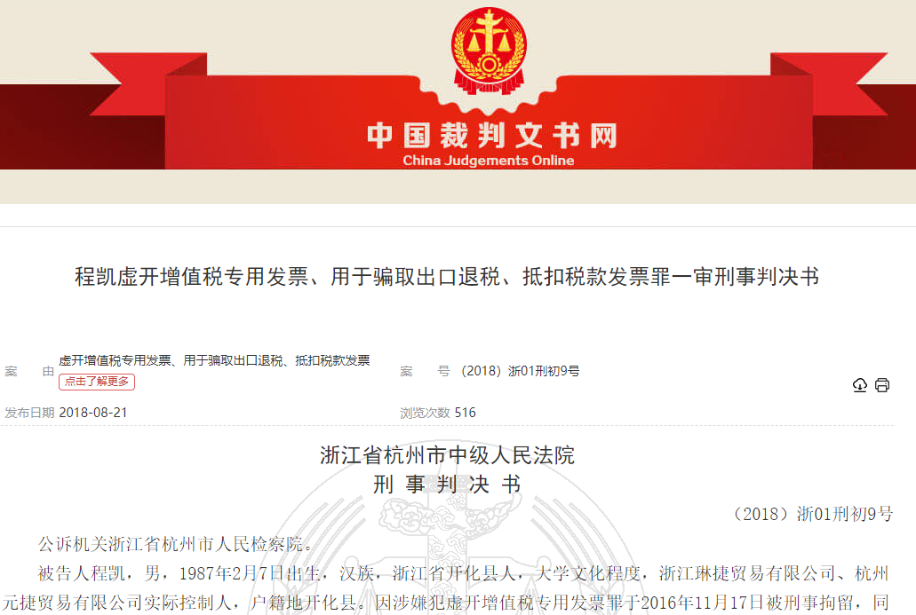 判决书显示,2016年2月至7月期间,被告人程凯为虚开发票从中牟利,伙同姜某、梁某1玉(均另案处理)等人在杭州市临安区先后注册成立浙江琳捷贸易有限公司(以下简称琳捷公司)、杭州元捷贸易有限公司(以下简称元捷公司)。上述公司成立后,被告人程凯等人在没有发生真实货物贸易也未对任何货物进行加工生产的情况下,以采购原油、沥青、重质油等名义,从山东省博兴县永鑫化工有限公司(以下简称永鑫公司)、青岛博德物流有限公司(以下简称博德公司)、青岛美福石油化工有限公司(以下简称美福公司)、上海屹唐实业有限公司(以下简称屹唐公司)、上海昌某实业有限公司(以下简称昌某公司)、建德市新航贸易有限公司(以下简称新航公司)虚开税额共计人民币4503.73万余元的增值税专用发票277份,并将发票上的货物名称变更为燃料油,为四川锦泰石油化工有限公司(以下简称锦泰公司)、东营市宝隆石油化工有限公司(以下简称宝隆公司)、湖州华某1化工有限公司(以下简称华某1公司)、青岛聚信合国际贸易有限公司(以下简称聚信合公司)虚开税额共计4591.66万余元的增值税专用发票322份。为掩盖虚开发票犯罪事实,被告人程凯等人还与淄博星运物流有限公司(以下简称星运公司)等物流企业签订虚假委托运输合同,接受上述物流企业虚开税额共计32.77余万元的货运增值税专用发票36份,并与山东临沂玉麒麟石油化工有限公司(以下简称玉麒麟公司)等单位签订虚假的油料委托加工合同。