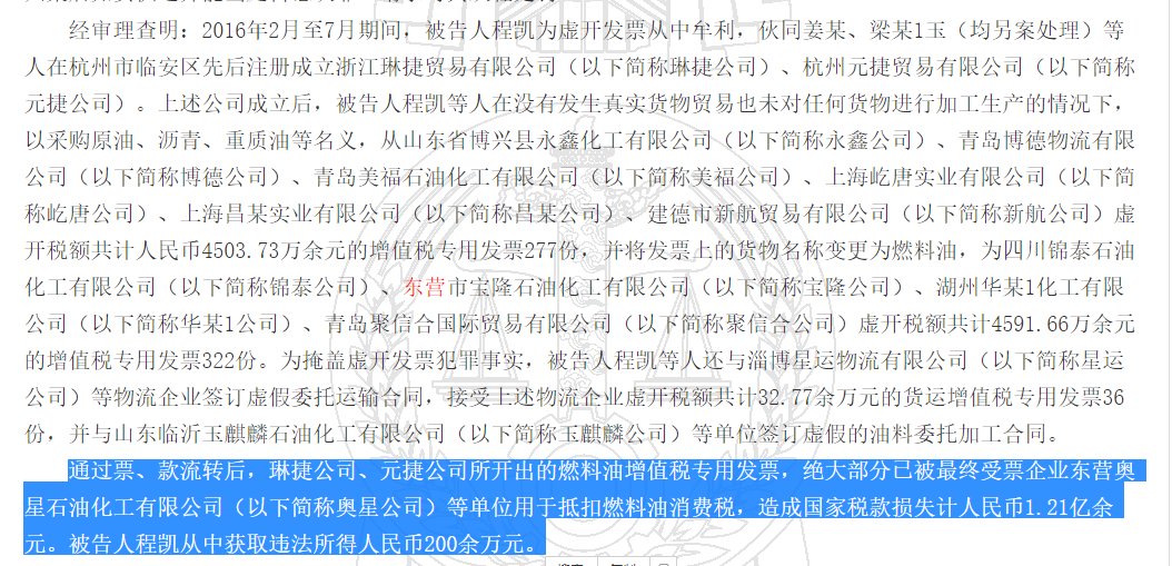 “东营奥星石油化工有限公司(以下简称奥星公司)为了达到逃避消费税和增值税,经过浙江琳捷贸易有限公司、杭州元捷贸易有限公司一系列票、款流转后,该公司所开出的燃料油增值税专用发票,绝大部分已被最终受票企业东营奥星石油化工有限公司等单位用于抵扣燃料油消费税,造成国家税款损失计人民币1.21亿余元。被告人程凯从中获取违法所得人民币200余万元。”法院查明