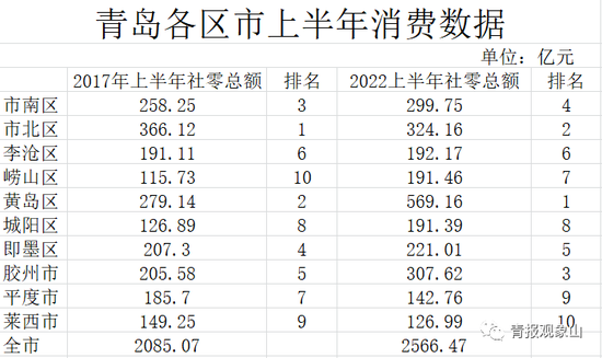 从上半年10个区市社消额排名看,前三强分别为黄岛区、市北区和胶州市。