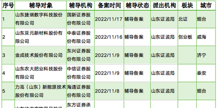 除上述5家企业外,11月辅导备案的鲁企还有力高(山东)新能源技术股份有限公司、山东帅克宠物用品股份有限公司、长寿花食品股份有限公司、山东天一化学股份有限公司。