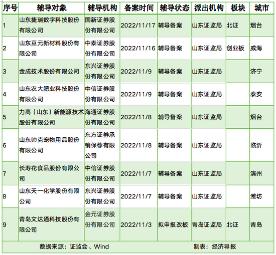 显而易见的是,进入11月份,鲁企辅导节奏明显加快。经济导报记者查阅证监会辅导公示系统及Wind,从11月3日至11月17日,共有9家山东企业提交辅导备案,包括申报改板的文达通。