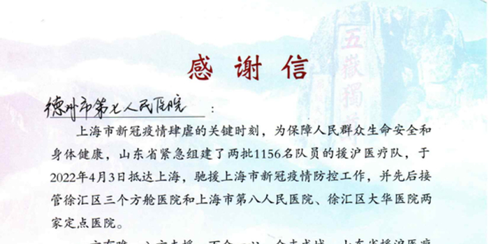 德州市第七人民医院——来自山东省援沪医疗队临时党委书记的感谢信