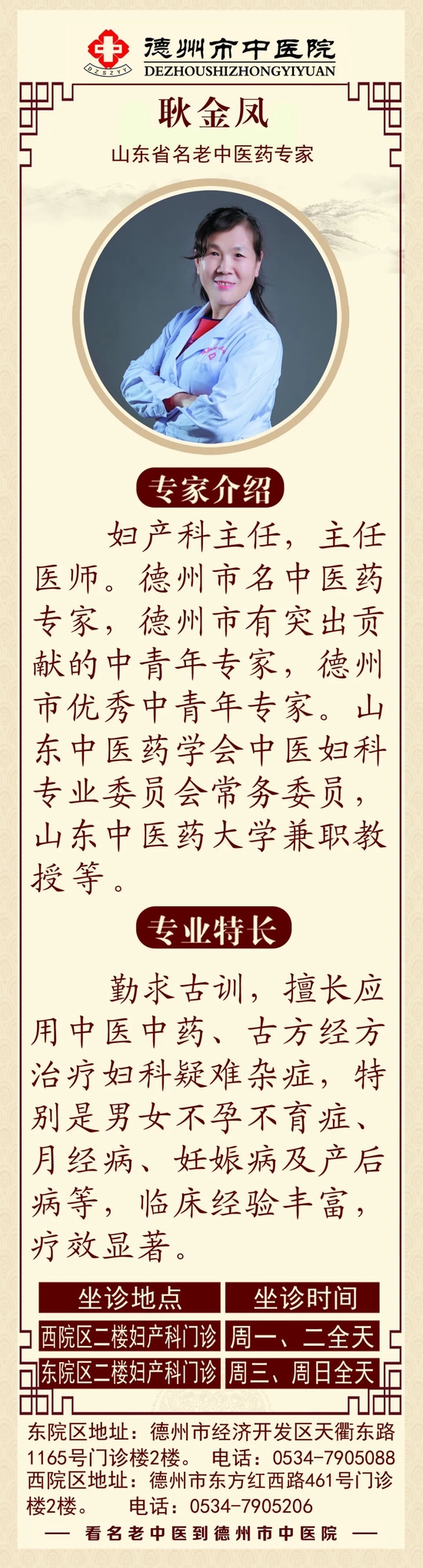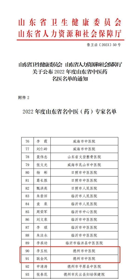 关注近日,山东省卫生健康委员会、山东省人力资源和社会保障厅公布了2022 年度山东省中医药名医名单,德州市中医院专家李玉杭、耿金凤获“山东省名中医(药)专家”称号。