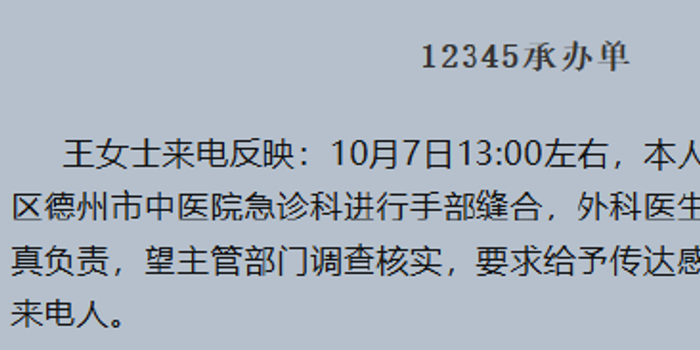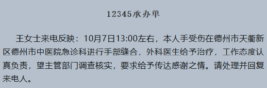 2025年10月7日中午,德州市中医院急诊科上演了温馨一幕。手部意外受伤的王女士(化名)在接受急诊科田德涛医师的紧急救治后,特意致电市民热线表达诚挚谢意,为医护人员的专业处置与暖心服务点赞。