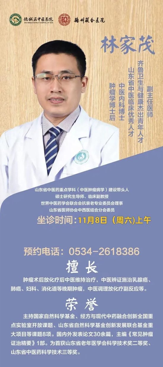 11月8日省肿瘤医院中医内科博士、肿瘤学博士后林家茂副主任医师来德城区中医医院坐诊