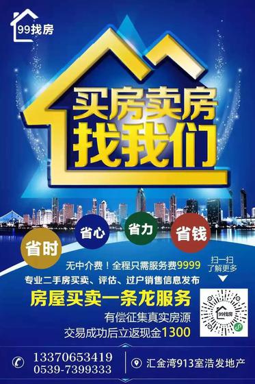 只要花9999元的交易服务费,就能享受一站式的保姆服务和方便、安全的交易环境。卖房、买房请上99找房,找最靠谱的中间商!省钱省力又省心!造福刚需买房者,让步入社会的年轻人,不再为生计劳于奔命,而为理想打拼!
