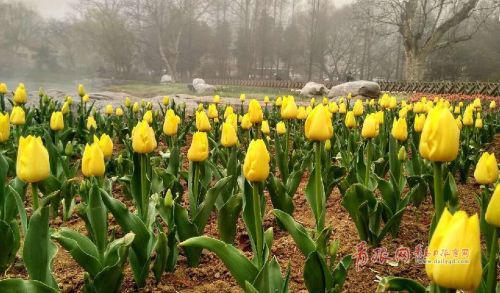 中山公园内黄色郁金香大面积开放,娇嫩欲滴惹人爱。
