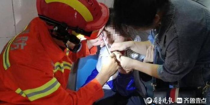 男孩贪玩手指卡进扫把铁管 聊城消防员紧张救援