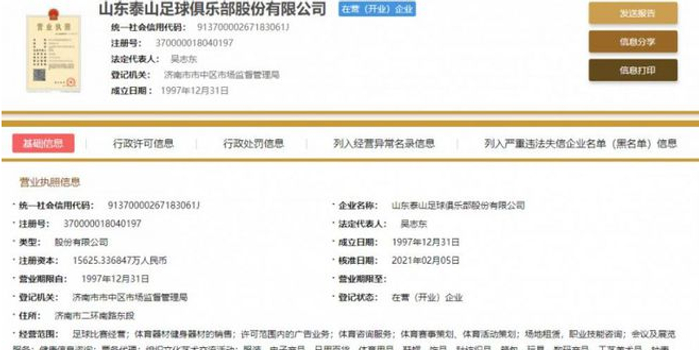 2月6日消息,国家企业信息系统查询内容显示,山东鲁能泰山足球俱乐部已正式更名为山东泰山足球俱乐部。
