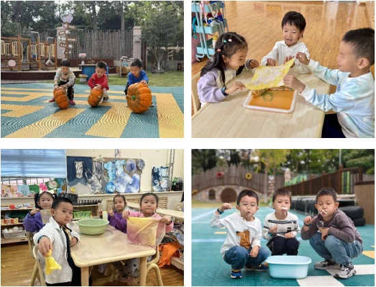 霜降时节,南瓜、柿子丰收。孩子们翻滚着圆滚滚的南瓜,在欢乐的氛围中感受秋收的喜悦;用柿子做染料,制作成独一无二的手帕;枯树枝也是大自然馈赠给孩子们的玩具,孩子们利用树枝制作“树枝泡泡机”,感受不一样的乐趣。