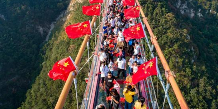 游客人人手举国旗游天蒙,营造了浓浓的国庆节日氛围,和景区火红的旅游景象相得益彰。