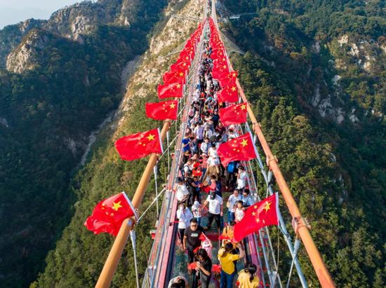 游客在海拔920米世界第一人行悬索桥上,感受祖国的青山绿水,掏出手机不停地与国旗合影,抒发着巍巍壮阔的爱国情怀。