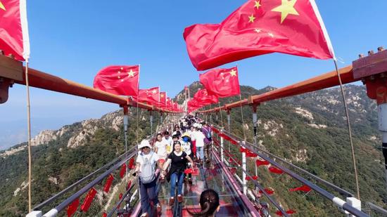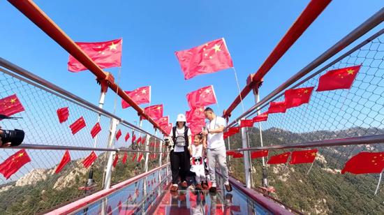 节日期间,整个景区都飘扬着中国红,近千面国旗在世界第一人行悬索桥、望海楼、沂蒙山小调活态博物馆、沂蒙风情商业街上空高高飘扬。