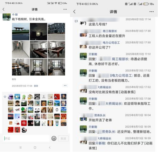 在项目部这段时间的学习、生活和工作,使我忍不住在朋友圈“炫耀”起了新宿舍的照片,配文“栽下梧桐树,引来金凤凰”,以前合作过的工友发出感叹“工人的含金量还在提升”,甚至还有工友以为我自己开了公司才创造了这么好的条件。项目部的伙伴们也纷纷点赞互动,陈经理还打趣评论道:“凤凰来了,我们这梧桐树更得枝繁叶茂,好好为大家遮风挡雨呀!”这般轻松融洽的人际关系,让我们即使身处外乡,也依然产生了一种归属感。