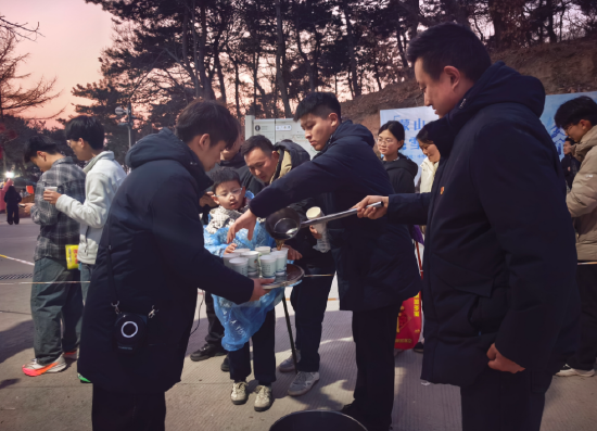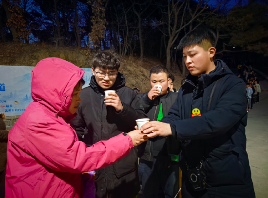 在做好入园限流的同时,沂蒙山龟蒙景区也用心服务好每一位已入园游客。2月19日随着夜幕降临,气温骤降,景区内仍有大量游客排队等候乘坐观光车或选择步行下山。考虑到夜间气温低、等待时间长,景区迅速启动暖心服务机制,在下山主要路口和索道站等重点区域增设御寒服务点,为游客免费提供热姜茶、热鸡蛋、一次性雨衣等御寒物资,并在排队区域安排NPC演员与游客互动,缓解游客疲劳,温暖下山路。