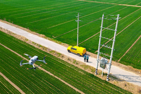 ▲国网聊城供电公司工作人员使用无人机对涉农线路开展巡视检查