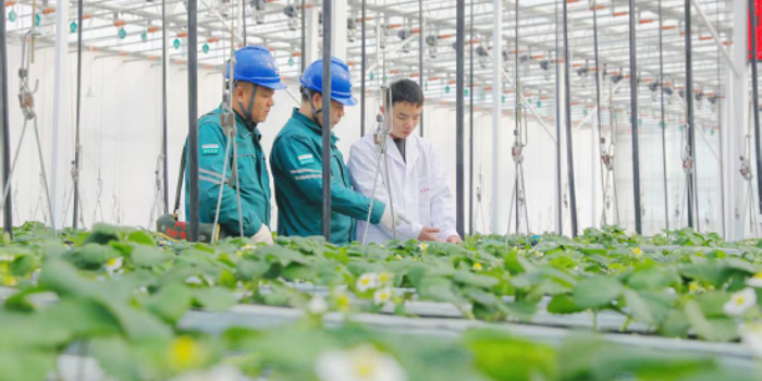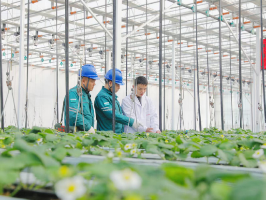 ▲国网济宁供电公司工作人员到草莓共富产业园排查设备隐患