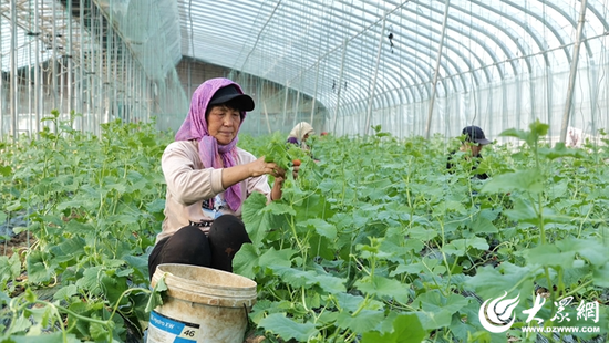 而在不远处的田庄村田甜合作社种植大棚内,同样是一派忙碌景象。温室大棚内暖意融融,农户们正穿行在甜瓜田中,手法娴熟地将植株上多余的侧枝(杈子)一一掰除。眼下正值甜瓜整枝打杈的关键时期,及时去除这些多余的须子,能避免养分消耗,让营养更集中地供应给主蔓和后续坐瓜。农户们小心翼翼地侍弄着瓜蔓,精心呵护着这些孕育着甜蜜希望的植株。