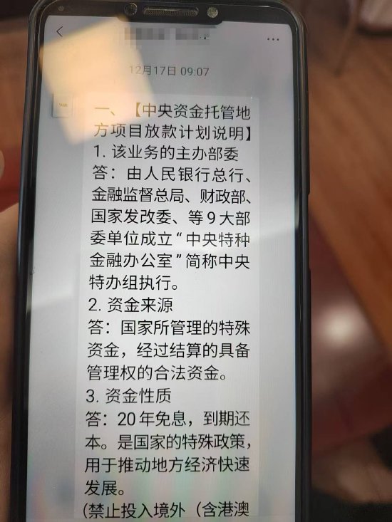 关注“你好,小伙子,你快帮我看看这个……”1月12日下午4点左右,一位满头银发的老大爷急匆匆地赶到农业银行山东德州市禹城支行营业部,连忙将手机递给接待他的客服经理李译程。只见他手机聊天记录里,赫然显示着“中央托管资金项目”“中央特种金融办公室”等看似“高大上”的名称,对方正以“高额回报”“国家秘密项目”的名堂,催促大爷转账进行投资,并承诺给予高额回报。大爷因拿捏不准,遂到银行求助。