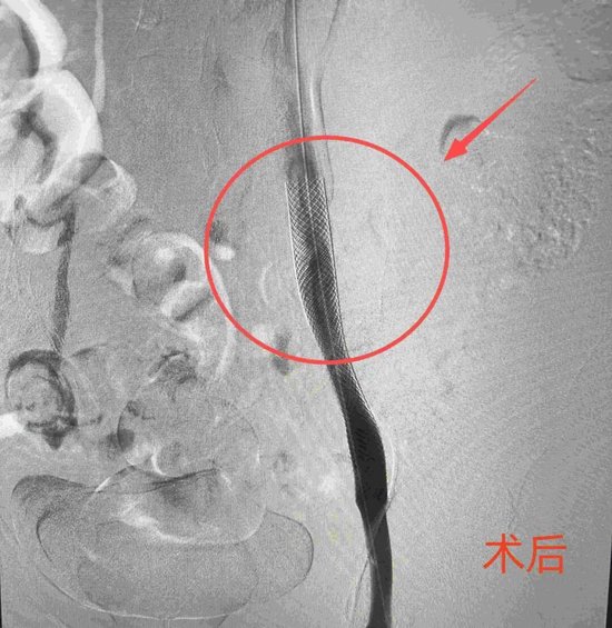 在局部麻醉下,介入科团队经右侧腘静脉成功穿刺,造影显示右髂外静脉存在约95%的极重度狭窄。团队随即对狭窄处施行了球囊扩张及支架植入术,术后造影显示支架定位精准,血流通畅,患者术前的酸胀感随之消失,手术顺利完成。