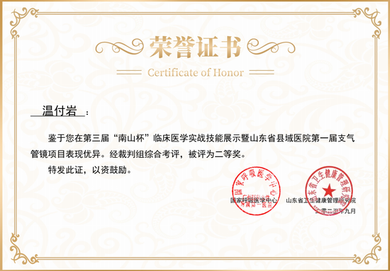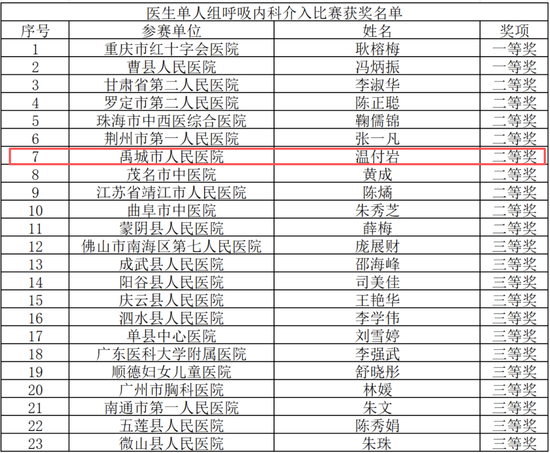 本次大赛从各省50余家医疗机构近400名青年医师中,通过初赛晋级出了26家医院的100名医师参加决赛。其中在呼吸介入项目单人赛中,禹城市人民医院呼吸内科温付岩医师表现优异,经过层层角逐,最终夺得全国大赛二等奖。充分展现了禹城市人民医院医师出色的专业能力与精湛的临床技能。