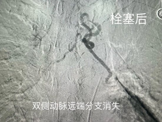 术中,介入团队通过患者右股动脉送入导管,精准找到了肺部出血的源头——异常增粗、迂曲的支气管动脉。随后,利用更精细的微导管将栓塞材料注入到这根血管内部,彻底堵死了出血点。术后造影显示,出血血管已被成功封堵,手术立竿见影。经术后抗炎、止血、化痰等综合治疗,患者恢复平稳,困扰多日的咯血症状得以解除。