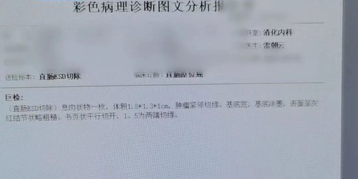 无独有偶,68岁的张女士同样面临健康挑战。此前在平原县人民医院接受肠镜检查时发现直肠粘膜病变,病变同样位于直肠距肛门10厘米处,但瘤体更为巨大,达到约4.5*4.5厘米,病理诊断为“低级别绒毛-管状腺瘤,局灶伴中度异型增生”。该患者同样合并严重冠心病、高血压。