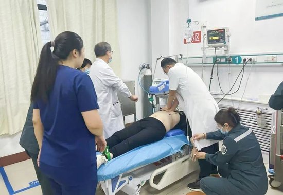 然而,病情的发展比车轮更快。就在家属拨打求救电话的39分钟后,下午1点57分,患者突发意识丧失,呼之不应。幸运的是,懂得急救知识的家属没有慌乱,他们立即展开了至关重要的现场胸外按压,为后续的抢救赢得了最宝贵的第一块基石。