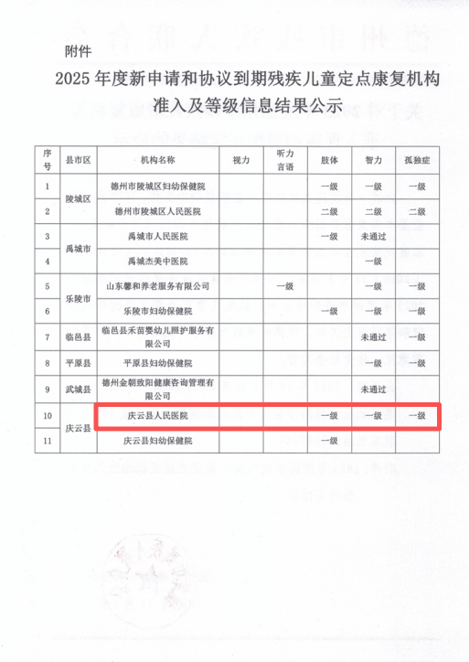 关注近日,德州市残联发布2025年度残疾儿童康复机构准入评审和等级评定结果的公示(依据《山东省残疾儿童定点康复机构评估标准》)。在此次评定中,庆云县人民医院儿童康复中心凭借专业的康复团队、规范的服务流程及优质的康复效果,顺利通过残疾儿童定点康复机构评审与等级认定,获得三项一级资质。