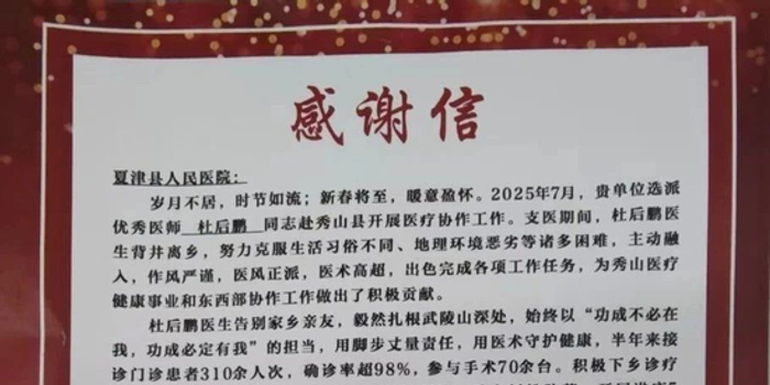 关注日前,夏津县人民医院收到了来自重庆市秀山县卫生健康委员会的一封感谢信,字里行间满含真挚谢意,深情赞誉了夏津县人民医院肝胆血管心胸外科援渝医师杜后鹏在秀山支医期间的敬业奉献与突出业绩。
