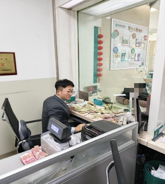 袋子里装满了皱巴巴的1元纸币、沾着油污的毛票,还有混着灰尘的硬币。大姐说,这是家里老人卖菜攒了好几年的,想存起来给孙子交学费。