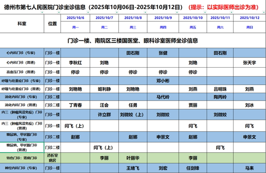德州市第七人民医院门诊坐诊信息(2025年10月06日-2025年10月12日)