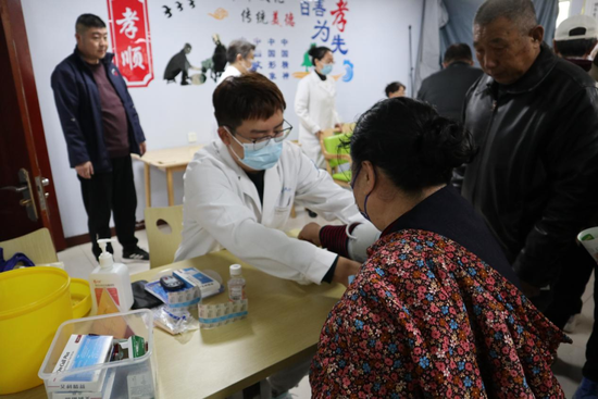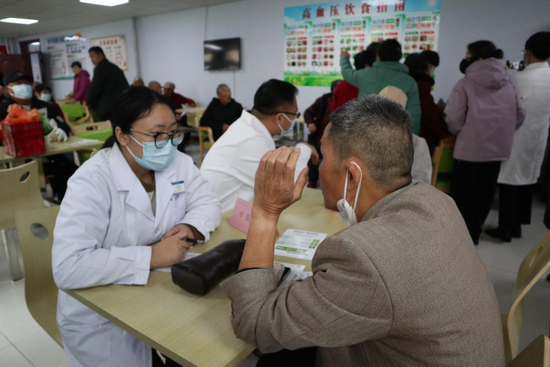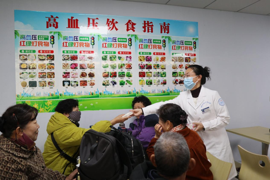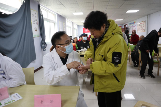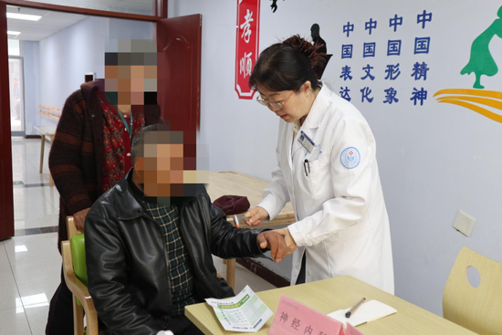 义诊环节,医护团队为老人们提供免费血压测量、健康评估等服务,用通俗易懂的语言为老人们解读检查结果,叮嘱日常健康注意事项。并针对高血压、认知障碍等老年常见疾病给予个性化诊疗建议与用药指导,中医科医生为老人们把脉,提供专业的医疗建议。团队还向养老公寓护理人员分享了脑卒中术后康复护理要点。