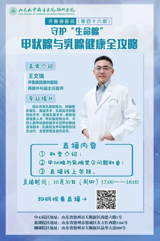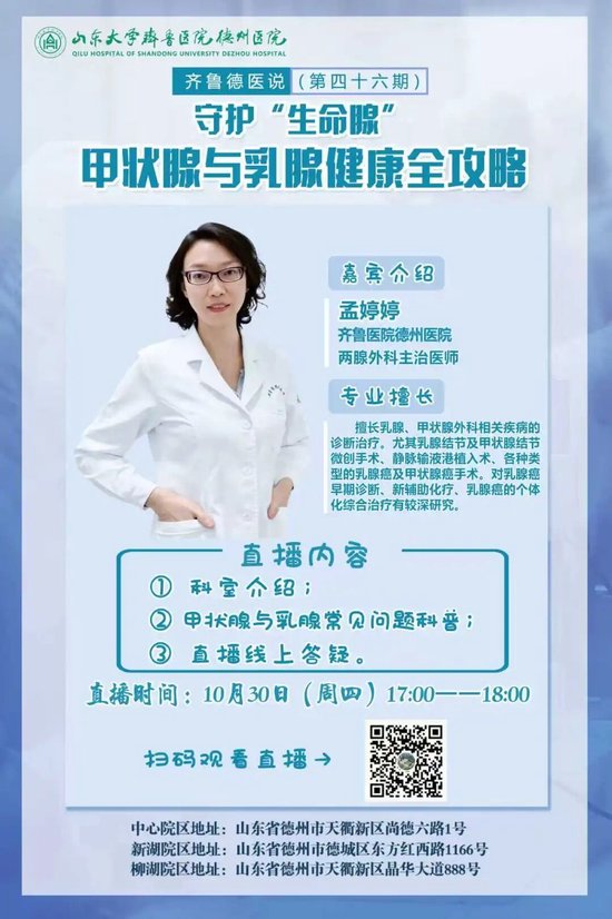 关注为了更好地服务社会大众,山东大学齐鲁医院德州医院将开展《齐鲁德医说》(第四十六期)大型直播活动,本次邀请到齐鲁医院德州医院两腺外科副主任医师王文瑞,两腺外科主治医生孟婷婷,针对甲状腺与乳腺等相关问题进行线上答疑,欢迎大家锁定10月30日(本周四)17:00,锁定《齐鲁德医说》!