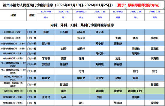 德州市第七人民医院门诊坐诊信息(2026年01月19日-2026年01月25日)