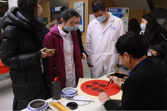 书画名家们铺展红纸、研墨挥毫,笔走龙蛇间,一幅幅寓意吉祥的春联、一个个饱满大气的“福”字跃然纸上。“医者仁心护健康,春风送暖入医院”“妙手回春驱病痛,翰墨飘香迎新春”每一副春联都将对医疗事业的敬意、对新春的期盼、对健康的祝福融入笔墨之中。