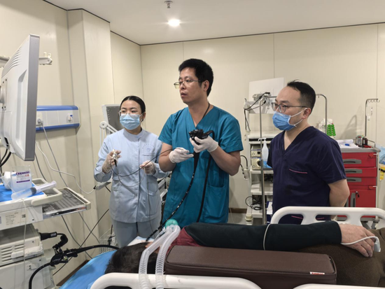 诊疗期间,王俊雄同步开展现场带教与技术指导,围绕超声胃镜操作规范、消化道早癌筛查与微创治疗、黏膜下肿物内镜处理等核心技术进行手把手教学与实操讲解,将前沿技术与临床经验倾囊相授,全面助力医院内镜中心医护团队专业能力提档升级。