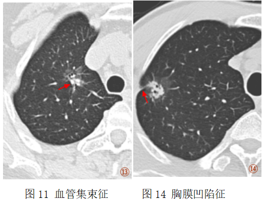 2.胸膜凹陷征:多见于邻近胸膜的结节,表现为脏层胸膜被牵拉,向结节方向凹陷。其形成常与肿瘤内纤维组织收缩有关,也常被视为恶性征象之一。