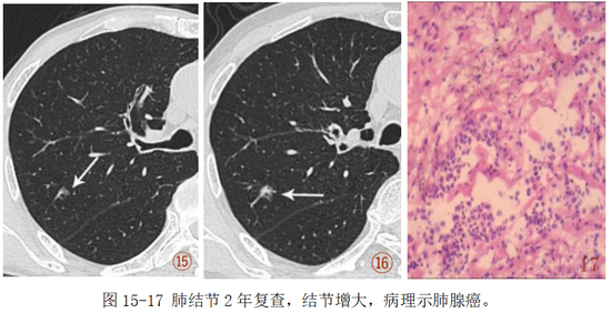 4.恶性病变:主要为肺腺癌(尤其是贴壁型生长方式),在8—30mm结节中约占10%—40%。