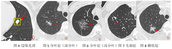 4.棘状突起征:表现为结节边缘的尖角状凸起,与毛刺征不同,棘状突起更粗短、呈尖角样。两者均为恶性结节的常见边缘形态,反映肿瘤向外侵袭生长的特点。