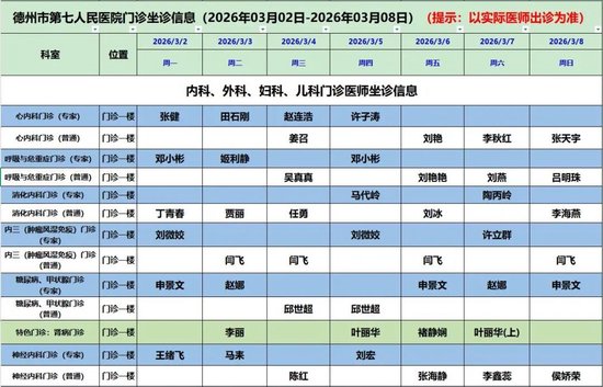 德州市第七人民医院门诊坐诊信息(2026年03月02日-2026年03月08日)