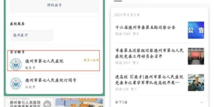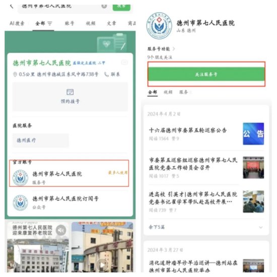 第一步:打开微信,微信搜索”德州市第七人民医院”微信服务号,点击“关注服务号”。