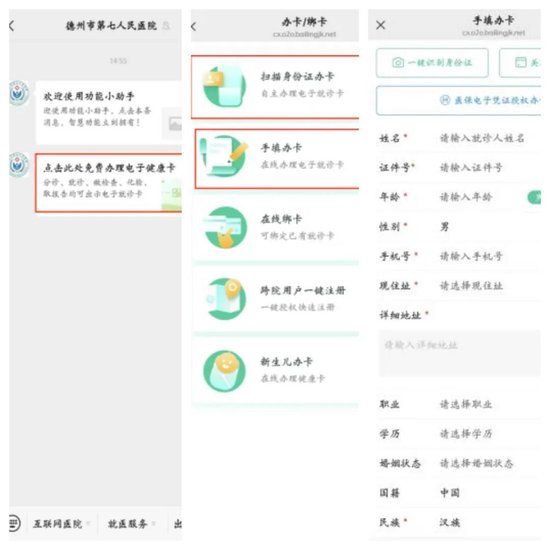 第二步:点击提醒消息,办理电子健康卡,如之前办理过可跳过该步骤,无卡患者可填写就诊人信息或扫描身份证办理电子健康卡,就诊过的患者可绑定已有健康卡。