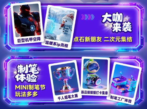 集章打卡:巨型机甲、萌新ip空降,等你来打卡!边逛边集章,还能兑换抽奖!新品猜猜猜:考验脑洞的时刻到了!猜对还有惊喜!千人组笔大赛:谁是“手速王”?快来挑战!现场比拼,赢取神秘好礼!