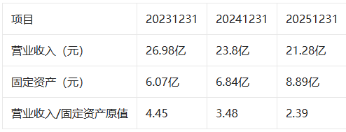 • 单位固定资产收入产值逐年下降。近三期年报,营业收入/固定资产原值比值分别为4.45、3.48、2.39,持续下降。