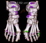 2、双能量CT检查:最常用的检查方式,双能CT伪彩图发现痛风石(绿色结节,如下图)对于痛风的诊断具有重要意义。