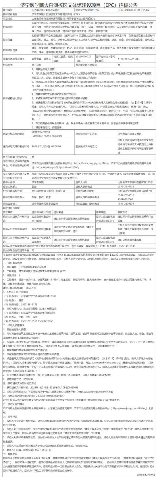 本招标项目济宁医学院太白湖校区文体馆建设项目(EPC)已由山东省发展和改革委员会以鲁发改项审[2025]290号批准建设,项目业主为济宁医学院,建设资金来自自筹资金,项目出资比例为100%,招标人为济宁医学院。项目已具备招标条件,现对该工程总承包项目进行公开招标。