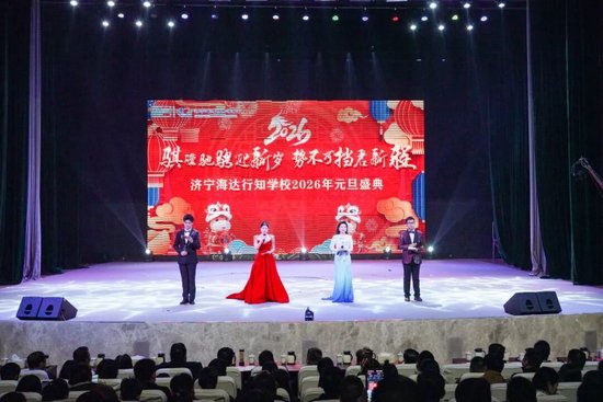 12月30日晚,济宁海达行知学校演艺中心华灯璀璨、笑语盈堂,2026年“骐骥驰骋迎新岁 势不可挡启新程”元旦盛典在此热烈举行。学校师生、家长代表与社会各界嘉宾欢聚一堂,共同见证了一场融合传统文化、青春活力与时代精神的视听盛宴。