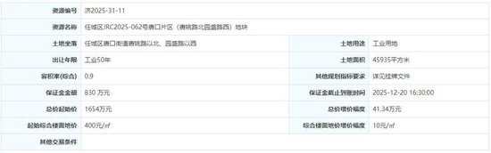 土地位于:任城区唐口街道唐姚路以北、园盛路以西;土地面积:45935㎡(约69亩);土地用途:工业用地;出让年限:50年;容积率不小于0.9;起始价:1654万元,综合楼面价起价:400元/㎡;最终成交价为:1654万元(约24万元/亩),综合楼面地价成交价:400元/㎡;溢价率:0.0%;
