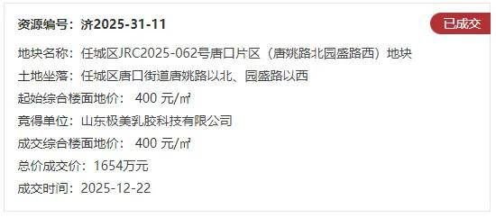 地块名:任城区JRC2025-062号唐口片区(唐姚路北园盛路西)地块[山东极美乳胶科技有限公司竞得]